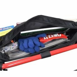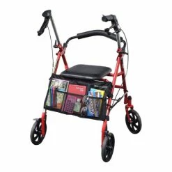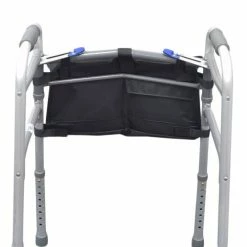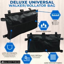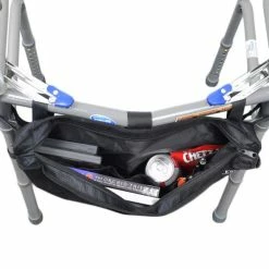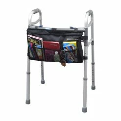 The copious carrying capacity of this 10″ by 18″ satchel is impressive with three handy mesh pockets in front, two in the rear, and a single large pocket in the middle that is further divided into additional internal pouches. You can attach this walker bag to the inside or to the outside of the walker or rollator using its “Easy-Install” Hook & Loop fasteners.