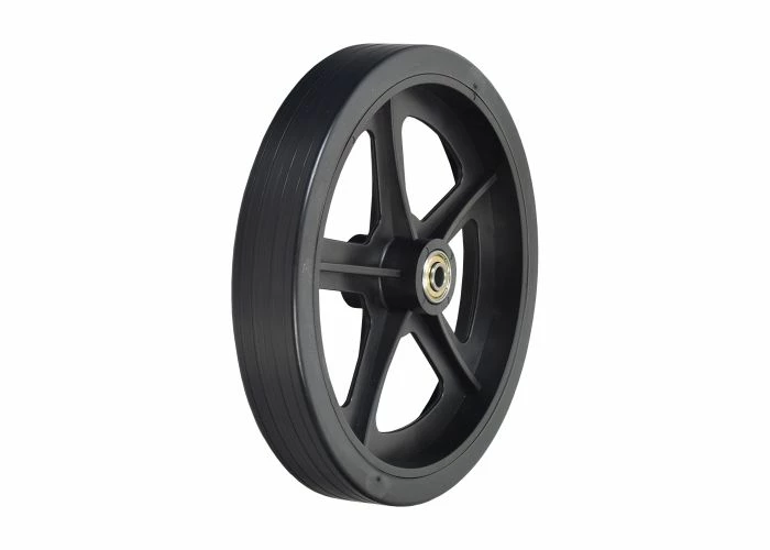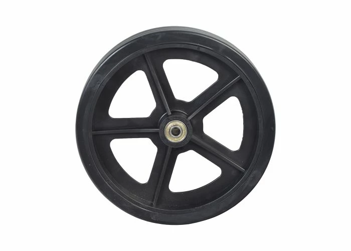 The 8″ wheel for the Drive Medical Bariatric Rollator (10216) uses soft-grip tires for indoor or outdoor use
