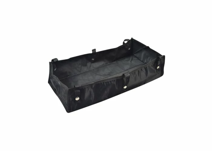 The black fabric bag is like a soft-sided bin that fits under the rollator’s seat and attaches to the frame by way of six webbing straps with snaps